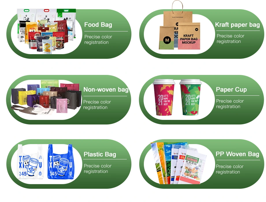 PE, BOPP, PET, CPP, 종이 및 기타 유연한 기판에 적합하며 식품 포장, 쇼핑백, 라벨 및 다양한 유연 포장 인쇄에 이상적입니다.